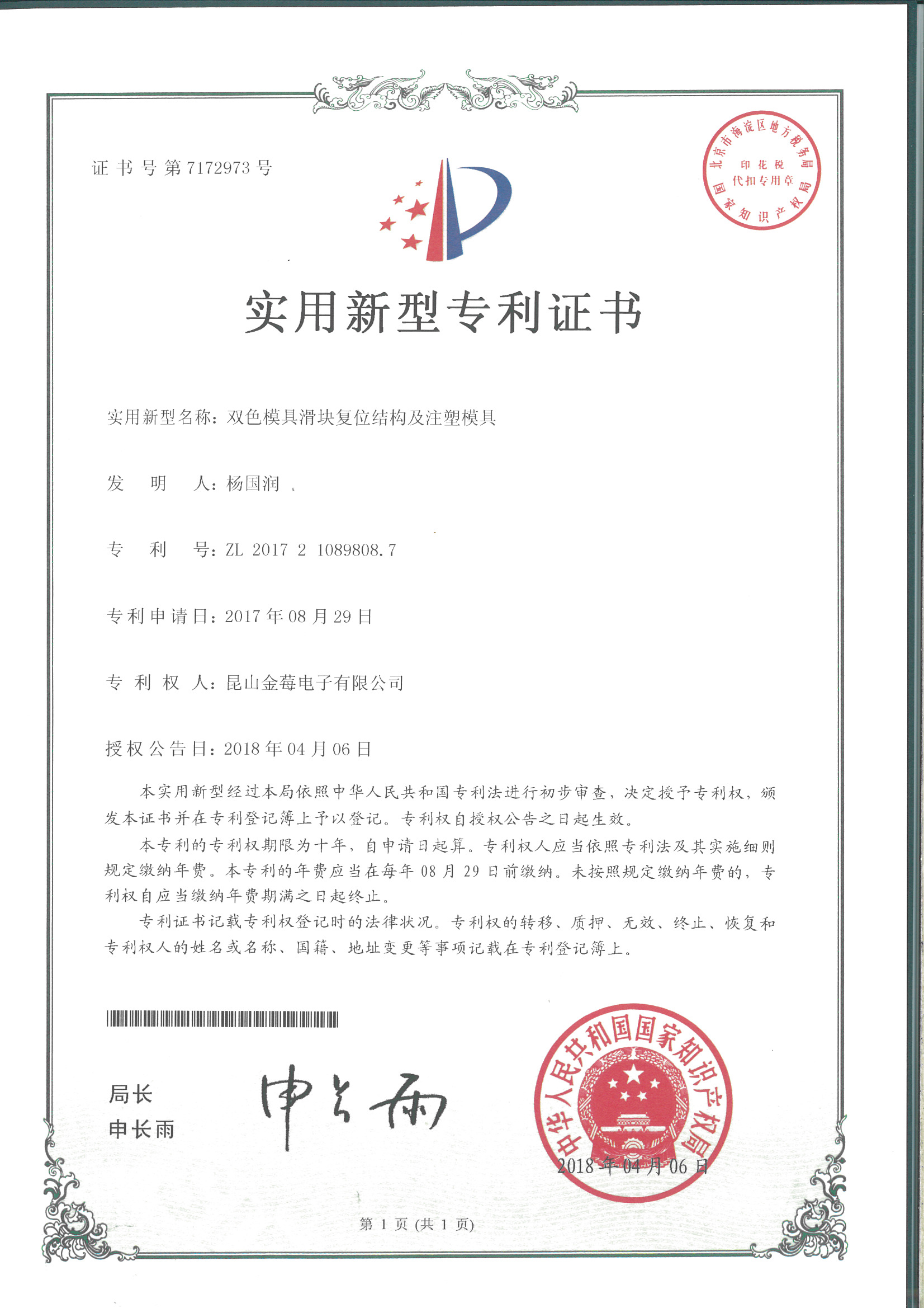 7172973專利號-雙色模具滑塊復(fù)位結(jié)構(gòu)及注塑模具