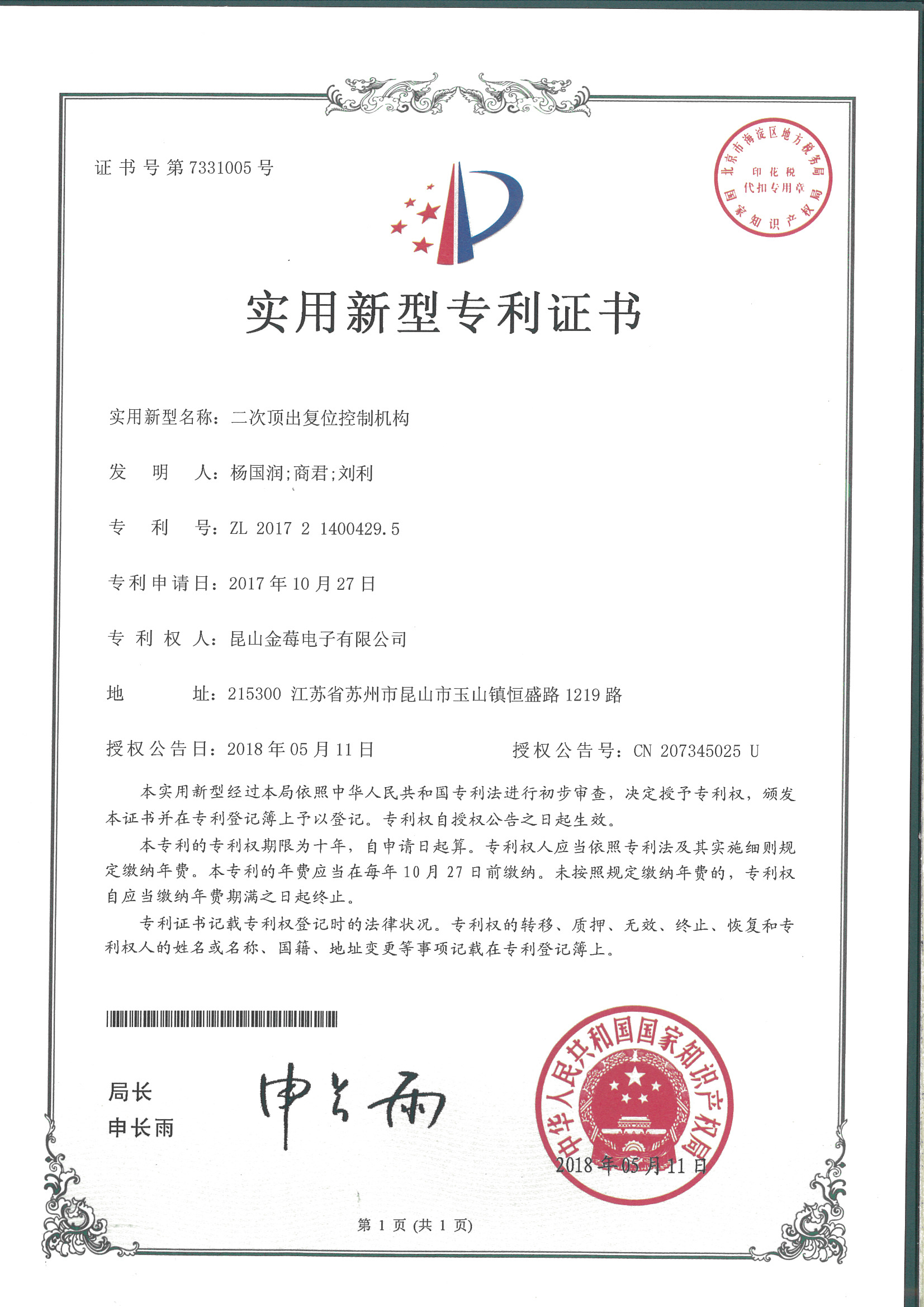 7331005專利號-二次頂出復(fù)位控制機(jī)構(gòu)