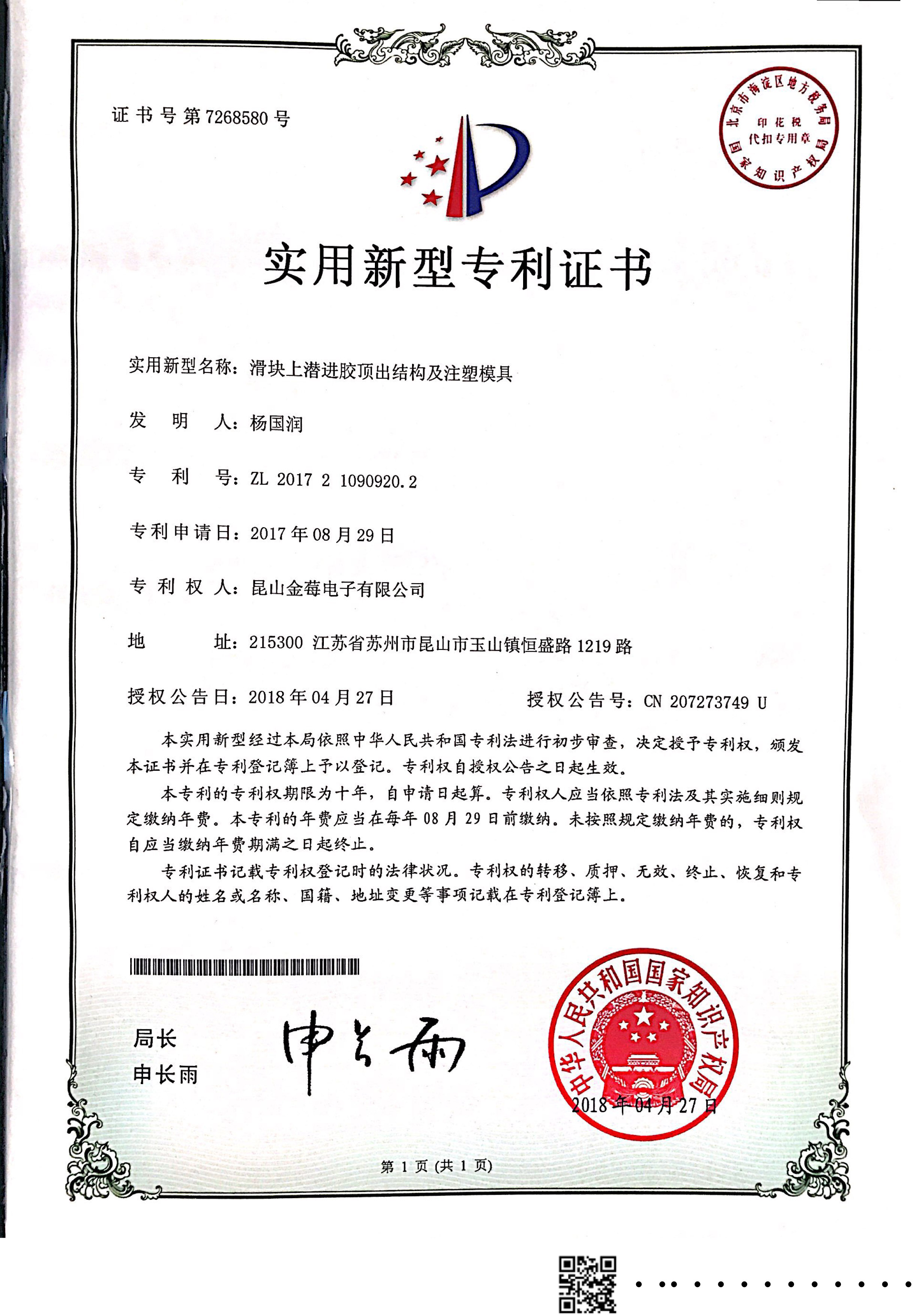 7268580專利號-滑塊上潛進(jìn)膠頂出結(jié)構(gòu)及注塑模具