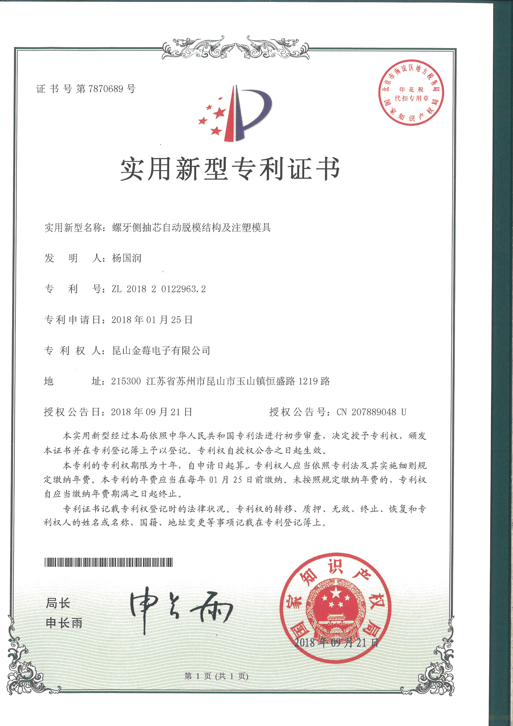 7870689專利號-螺牙側(cè)抽芯自動脫模結(jié)構(gòu)及注塑模具